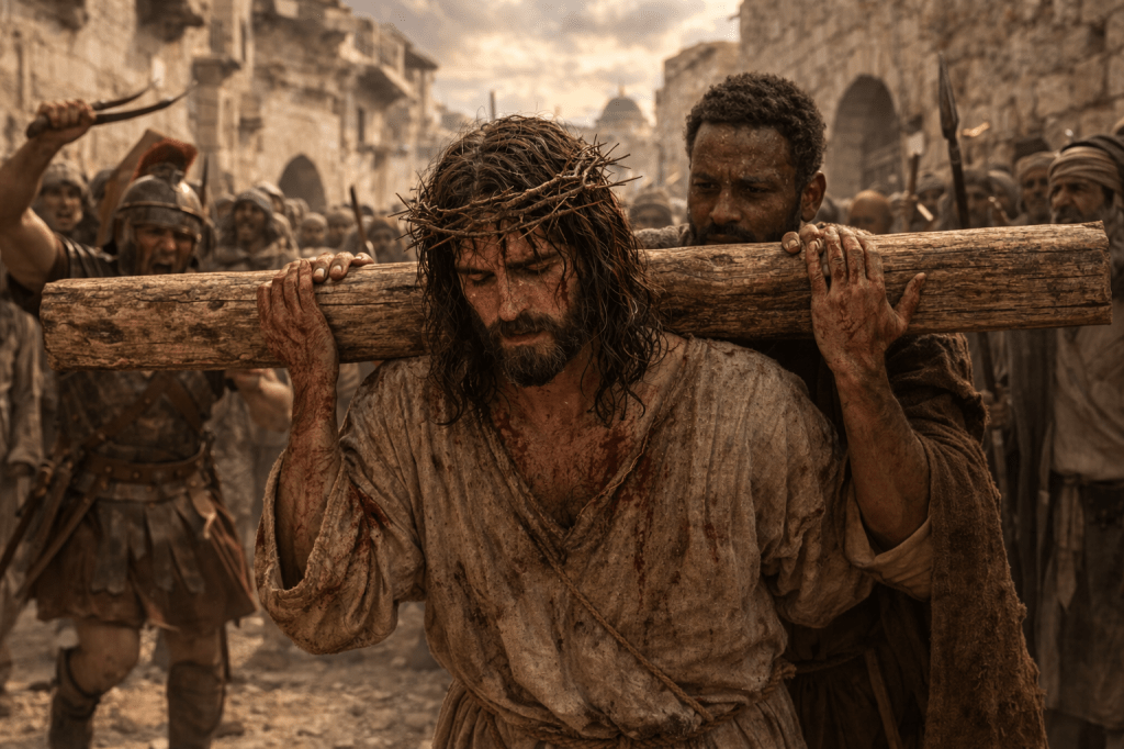 “They compelled a passerby, Simon of Cyrene… to carry His cross.” — Mark 15:21