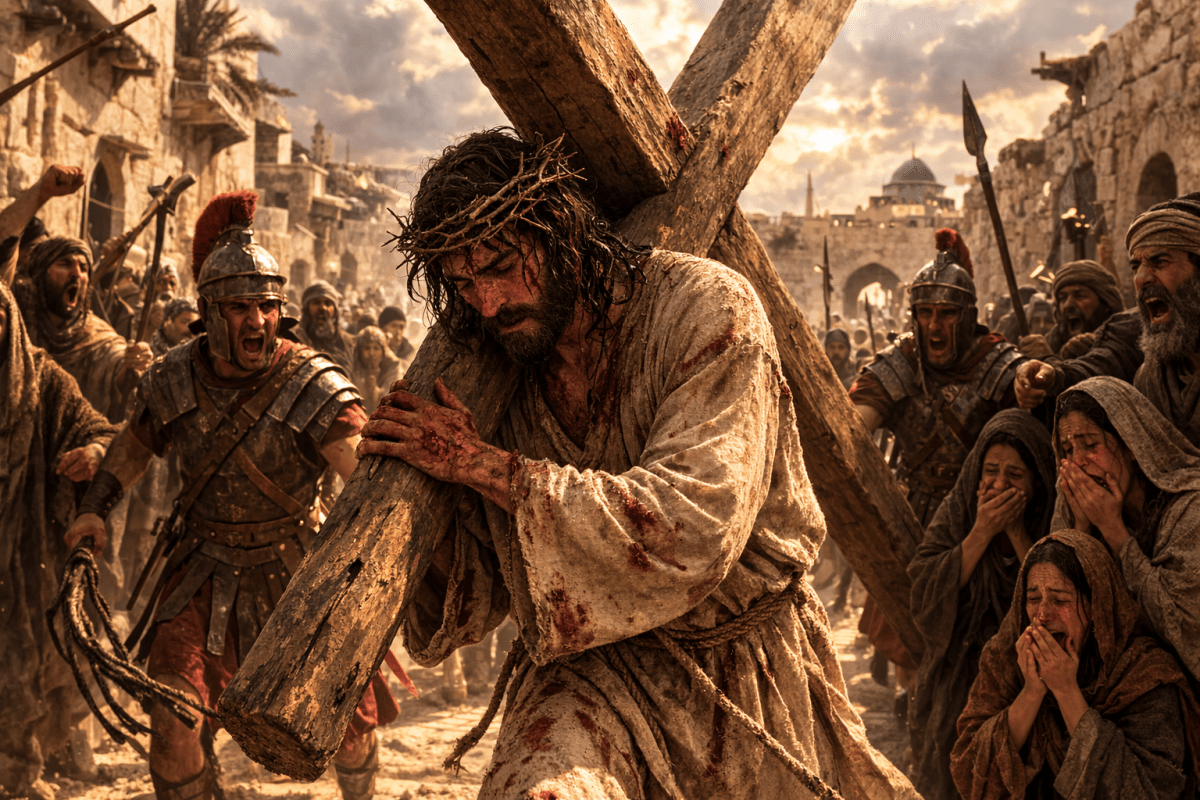 Jesus had already been scourged under the authority of Pontius Pilate. Roman scourging alone could leave a man barely able to stand. His back was torn open. Soldiers pressed a crown of thorns into His head, mocked Him, struck Him, and laughed at Him. Then they placed the cross on His shoulders—a rough, horizontal beam tied to His arms, weighing seventy to one hundred pounds.